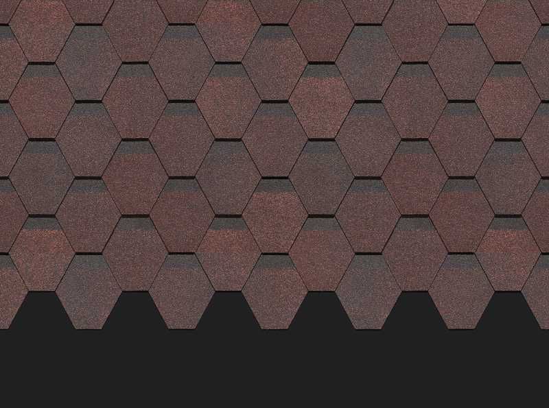Насыщенные благородные оттенки с мягкими переливами цвета смотрятся благородно и дорого. Гексагональная форма лепестков гонтов и затемненные участки создают эффект объемного покрытия. Черепица отлично смотрится со светлым бежевым сайдингом, фасадными панелями под сланец, песчаник, юрский мрамор.