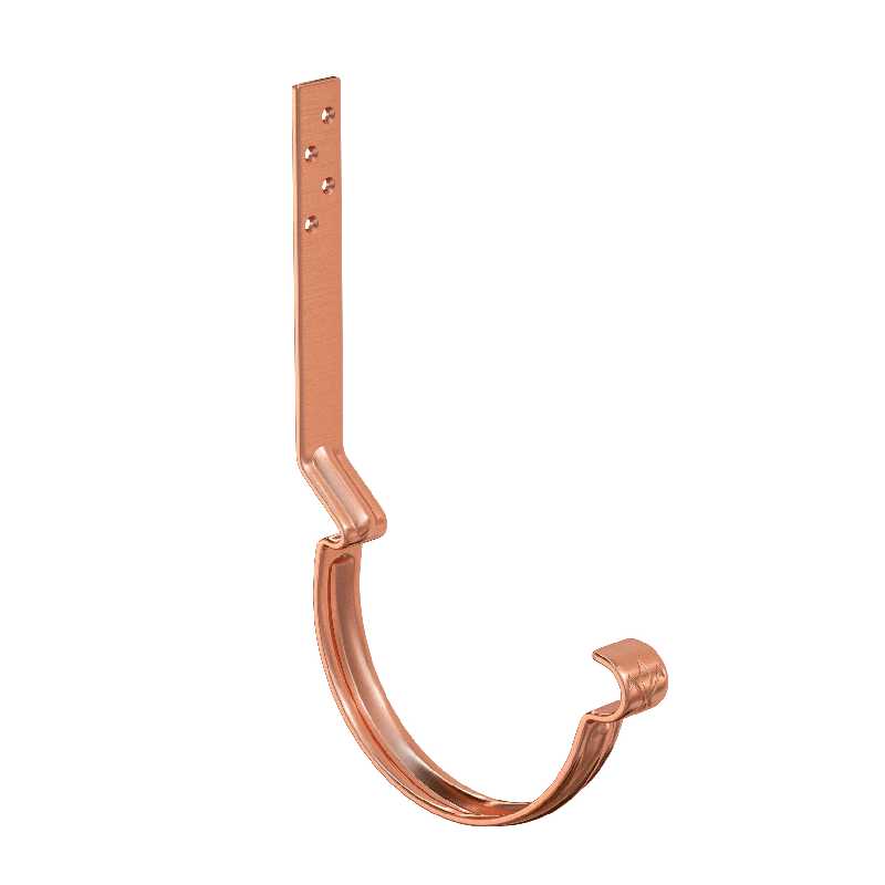 Крюк крепления желоба — цельнометаллический, изготовлен из стали толщиной 4 мм. Обеспечивает силовую поддержку желоба и неизменность его геометрических параметров, создаёт уклон, необходимый для движения воды в заданном направлении. Благодаря ребрам жесткости обладает повышенной прочностью, выдерживает большие силовые нагрузки.-Задний замок выполнен со смещением, что позволяет обеспечить наличие вентиляционного зазора между желобом и лобовой доской -Увеличенное «монтажное плечо» крюка (160 мм – длинный крюк; 230 мм – удлиненный крюк) удобный монтаж на разные уклоны крыши-Дополнительное ребро жесткости, увеличивающее прочность и надежность крюка-Особая марка стали повышенной прочности, цельнометаллическая полоса толщиной 4 мм с оцинковкой 275 г/м.кв.-Уникальность подтверждает фирменный штамп «лилия» расположенный в передней части.