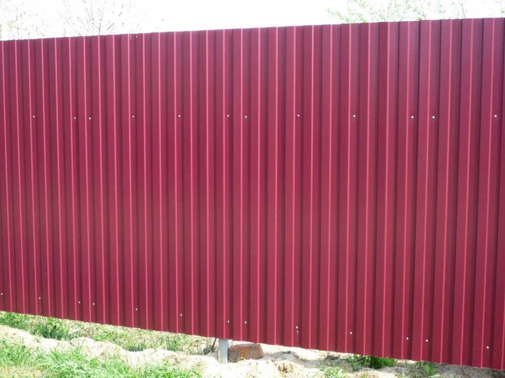 Профилированный лист С-8x1150-A (ПЭ-01-3005-0,45) часто используется в Любани для обустройства забора. Изначально он представляет собой стальной оцинкованный лист с покрытием. Толщина металла с цинковым и защитно-декоративным слоем — 0.45 мм.Проходя процедуру холодного проката, сталь принимает волнообразный вид. Такая форма придает профилю несущую способность.