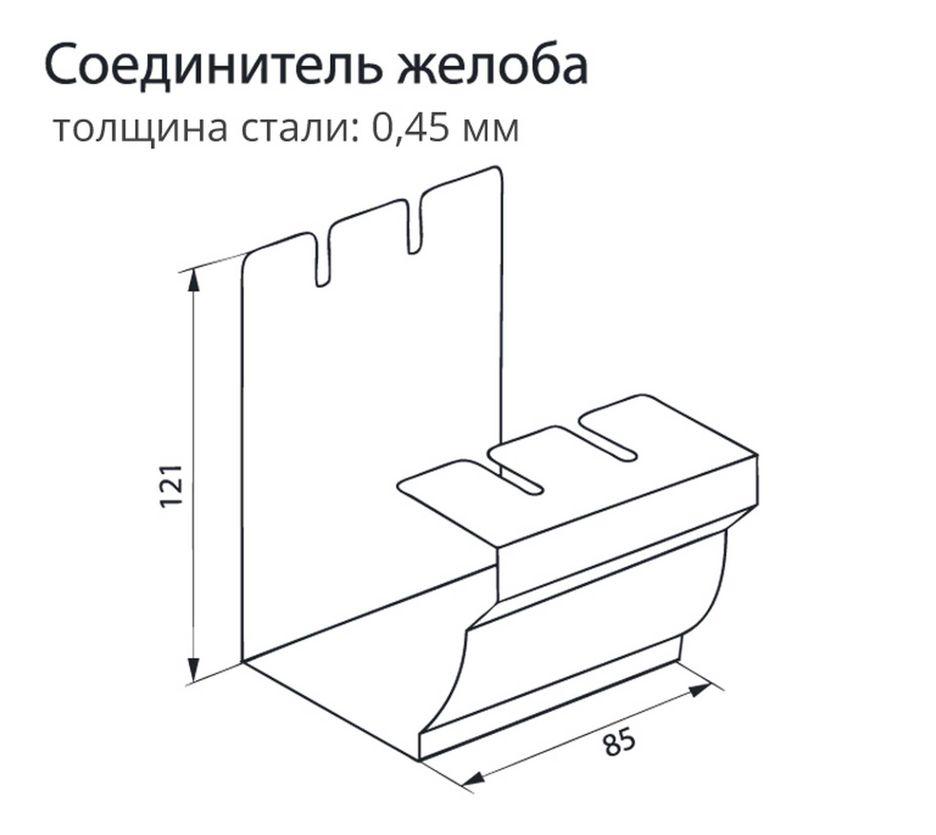 Соединитель желоба обеспечивает соединение желоба или желоба с углами, компенсирует температурное расширение. Дополнительно заполнить стыки силиконовым герметиком.
