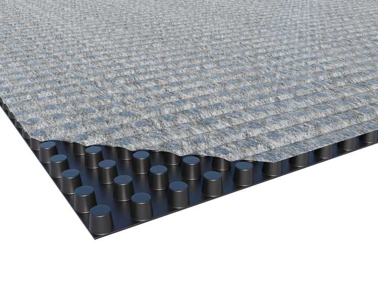 Многофункциональная профилированная ПВП-мембрана с припуском для нахлеста с одной стороны и термически прикрепленным полотном Typar из полипропилена.